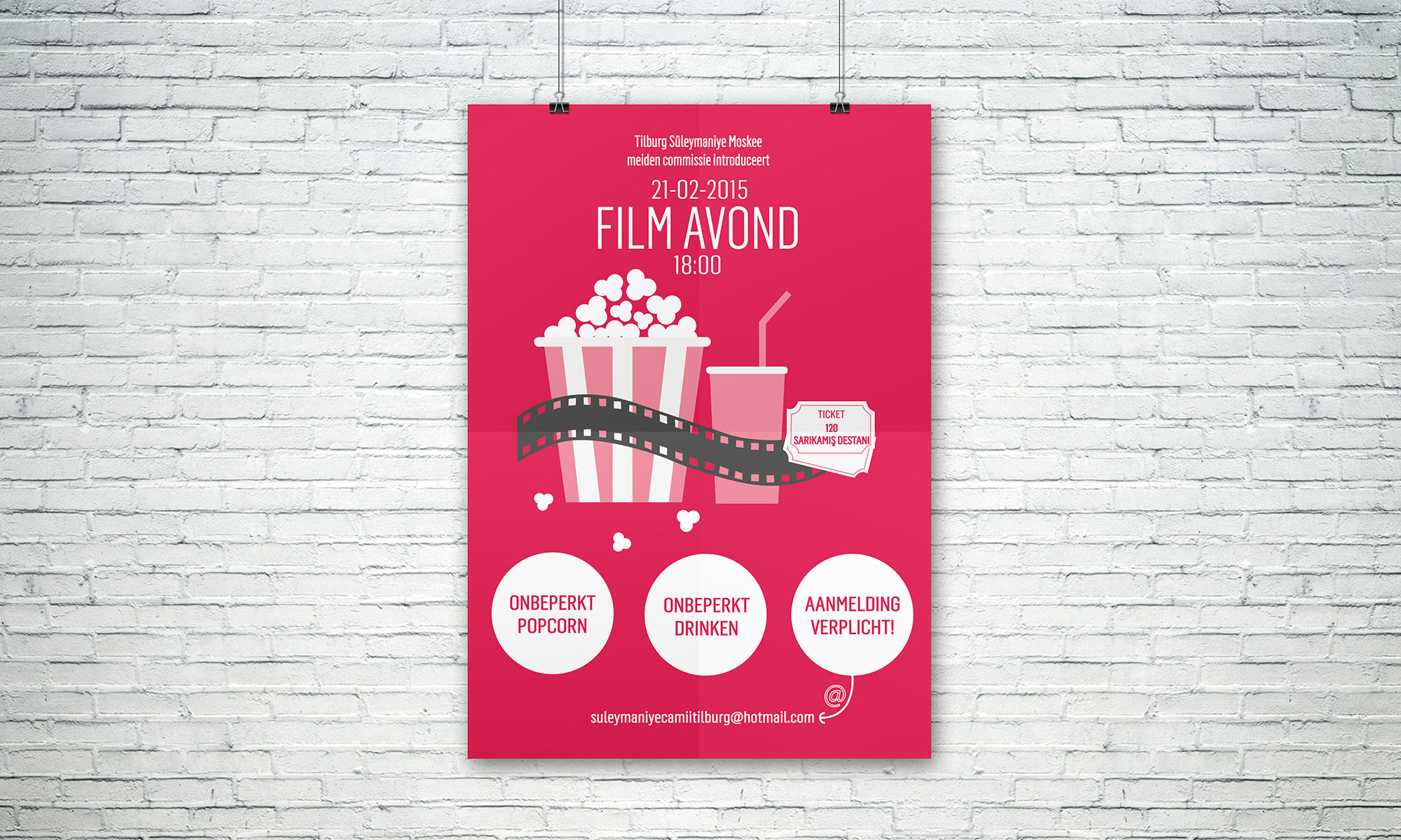 Ik kreeg de opdracht van de damescommissie van de suleymaniye moskee te tilburg om een poster te ontwerpen voor een filmavond. Hierboven staat het resultaat