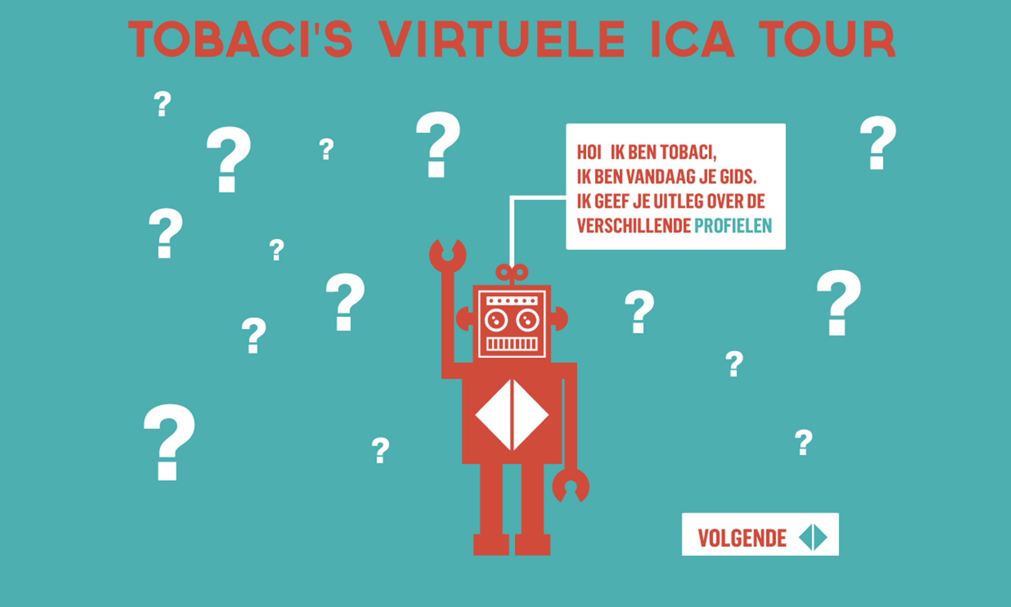 Als projectgroep kregen we de opdracht om een interactieve multimedia materiaal te maken waarmee aankomende studenten die net van de HAVO/VWO afkomen, net afgestudeerde MBO studenten en ouders extra informatie kunnen vergaren. De belangrijke punten van het schoolgebouw hebben we verwerkt in de virtuele tour. Je kunt meer te weten komen over de profielen die aangeboden worden in het tweede leerjaar. Tobaci, de virtuele ica bot leidt je door het schoolgebouw.